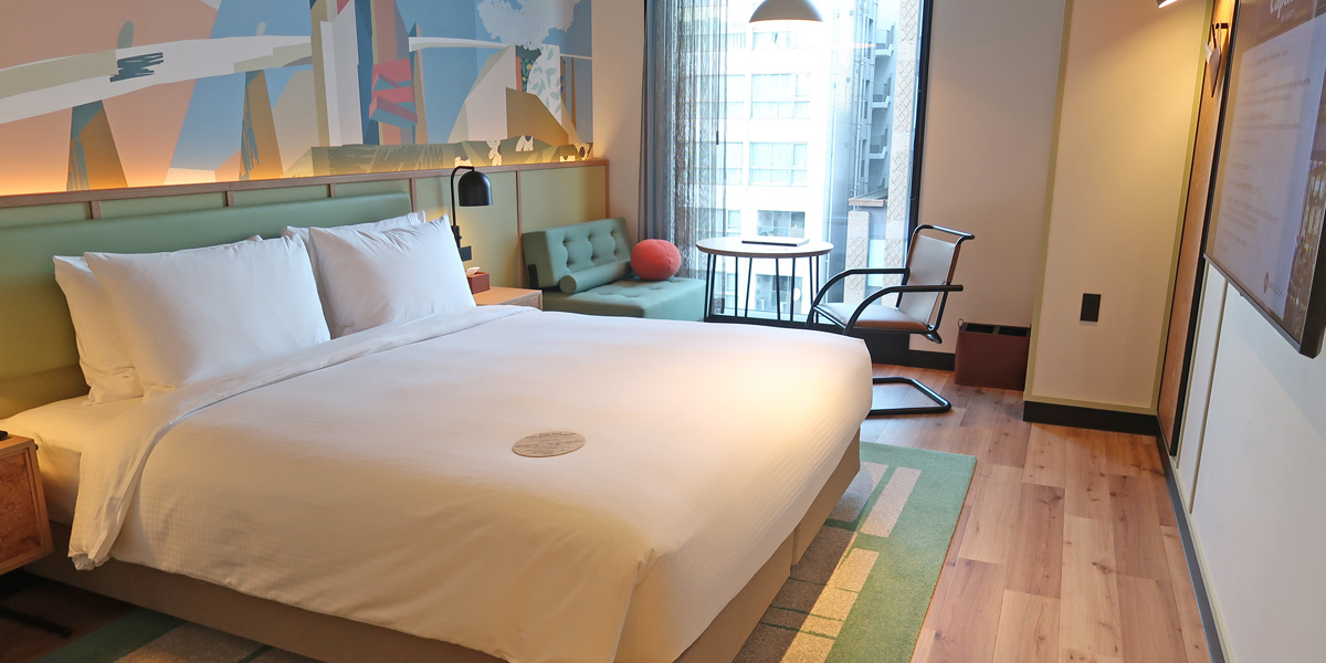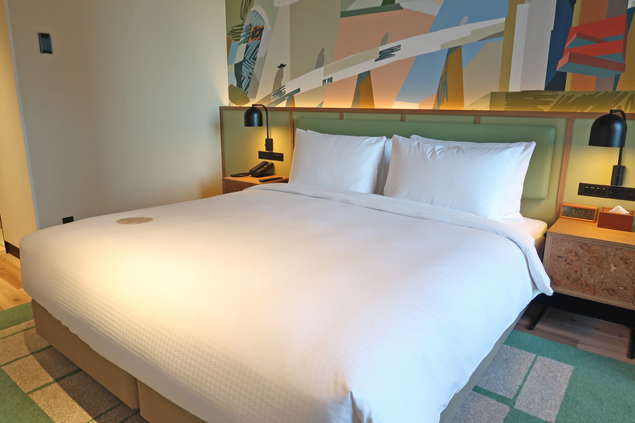 左/壁面に描かれたカラフルなアートが印象的なベッドルーム。ベッドサイドの電源はUSB-Cにも対応。