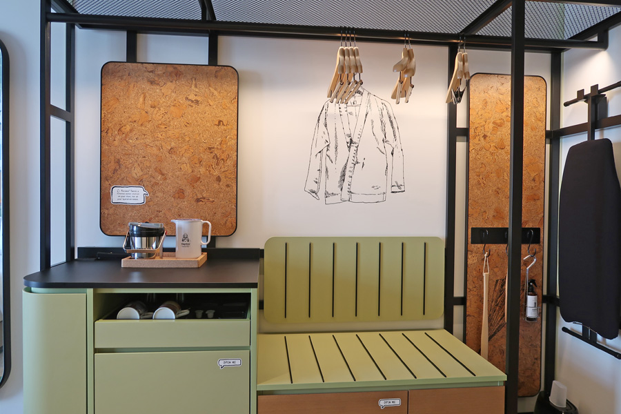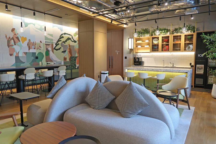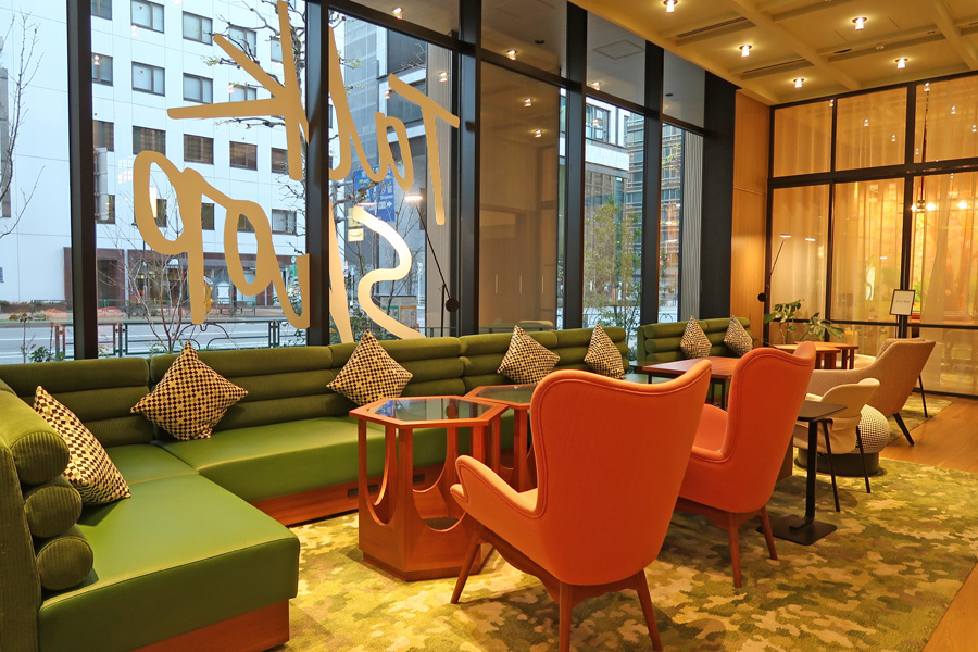 左/ロビーの代わりに用意されるホテル独自のトークショップ。ゲストのウェイティングスペースも兼ねる。