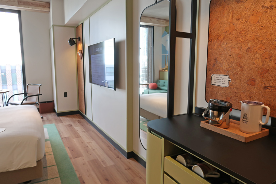 右/客室はシンプルですっきりとしたレイアウト。水は館内のウォーターステーションで補充する仕組み。 |