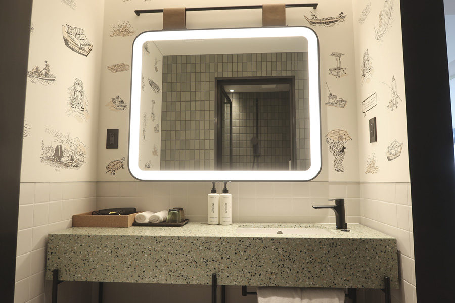 右/バスルームは全室シャワーブースのみでスペースはミニマム。壁に描かれたイラストがアクセント。 |