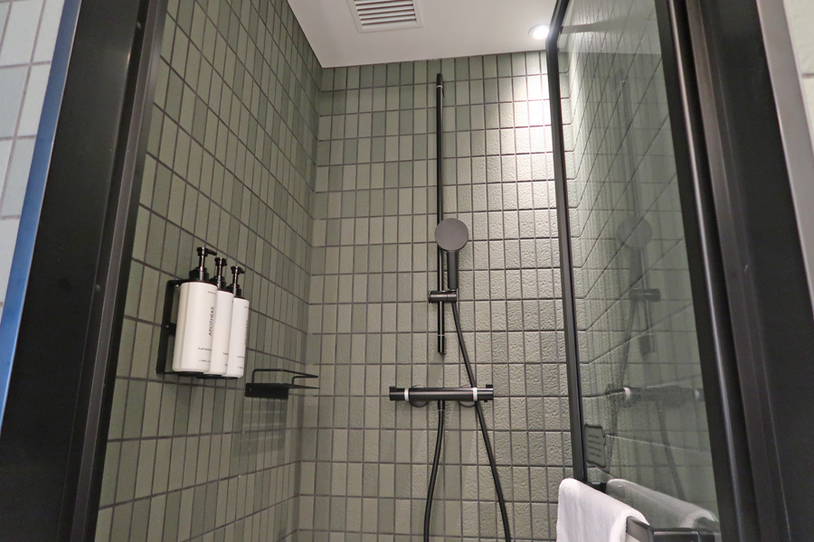 左/グリーンのタイルが美しいシャワーブース。ハンドシャワーの高さを調節するのに少し手間取った。