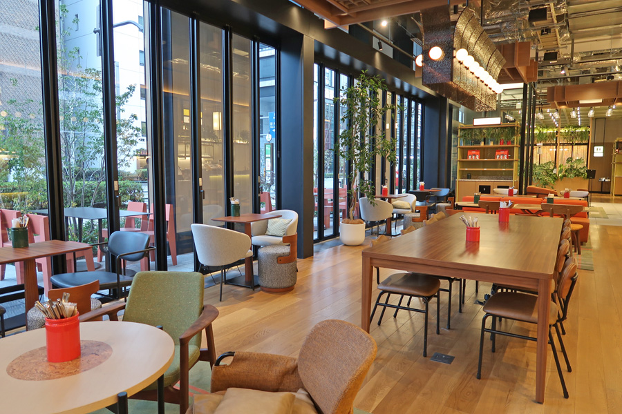 左/1階にあるトークショップはオールデイダイニングとしても機能。朝食時は宿泊ゲストのみ利用可能。