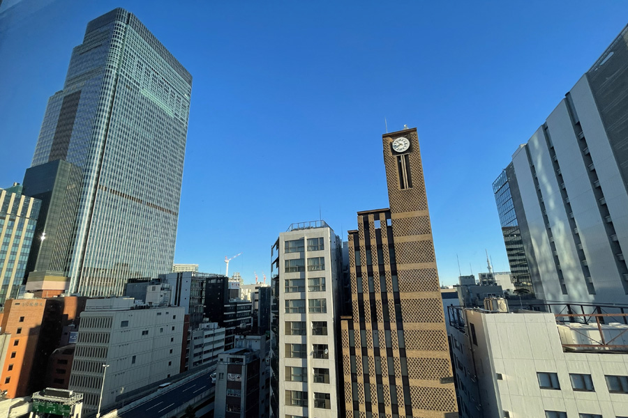 右/9階の客室からの眺め。目の前に聳える時計台と東側に建つビルの隙間にはスカイツリーの姿も。 |