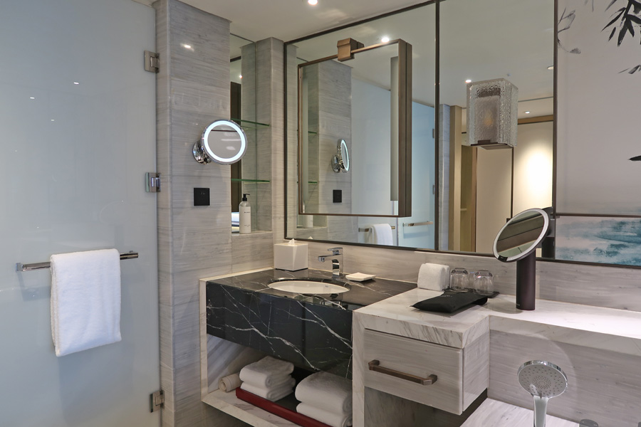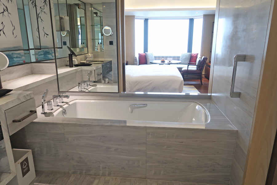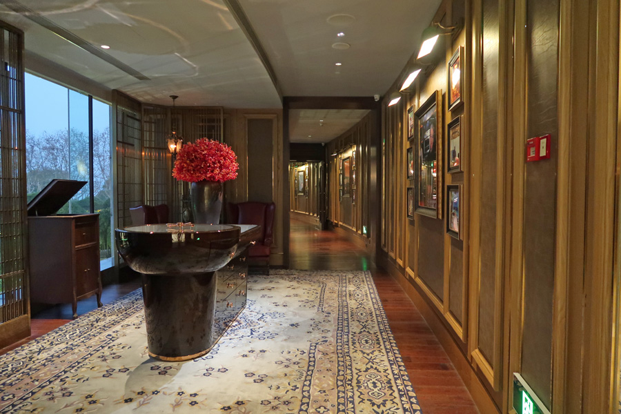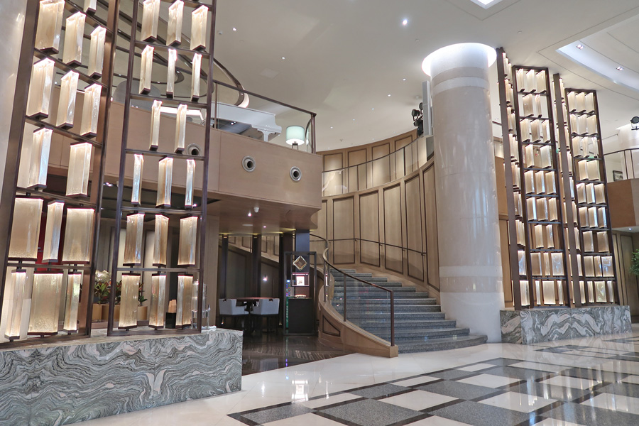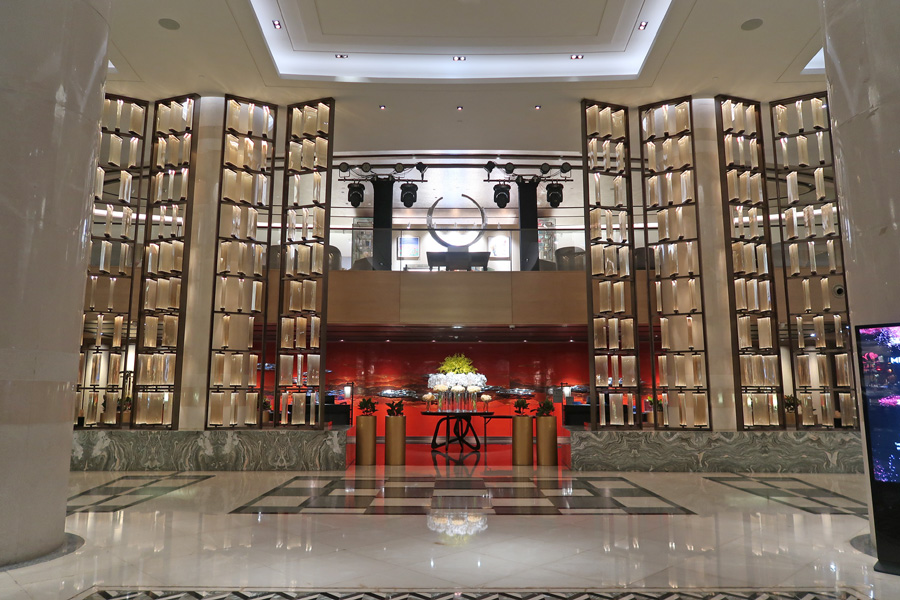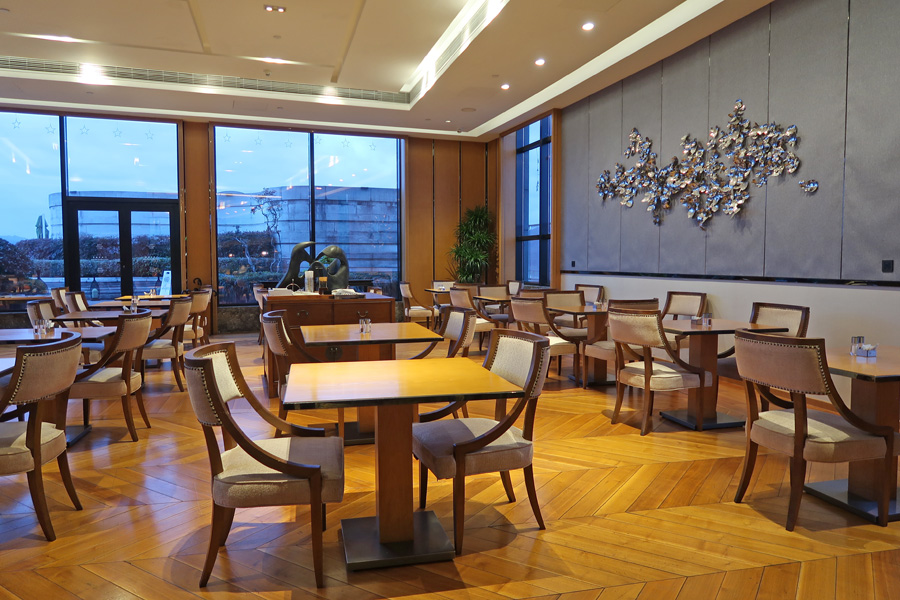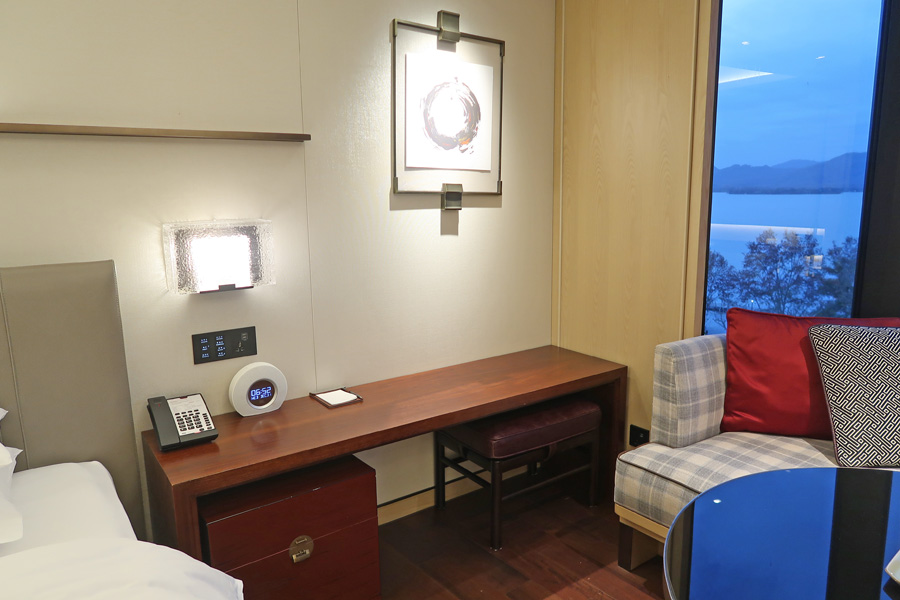 | 大都市でありながら市街地のすぐそばに世界遺産の西湖と大運河(京杭運河)を擁する一大観光地の杭州の中でも西湖の湖岸に立地し、かつ地下鉄での移動にも便利なロケーションに建つ希少なホテル。弧を描く館内は湖側の窓が少し小さくなってしまうものの出窓で眺望が確保され、山の斜面に家々の明かりが灯る夜景も美しい。館内は賑わいがありつつも落ち着いた雰囲気で、8階にあるクラブラウンジも充分な空間が確保され、朝食やカクテルタイムのフードメニューも豊富で滞在中は何度も足を運んだ。 |