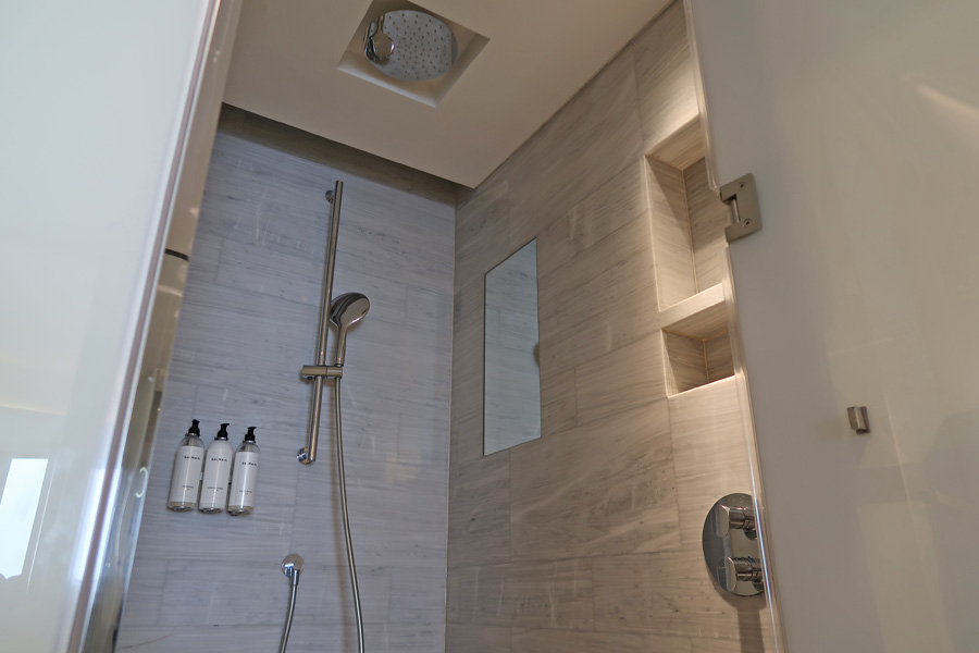 右/奥行きがあるシャワーブース。ハンドルが手前にあるので濡れずに温度を調整できるのがポイント。 |