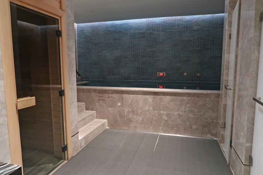 右/2階にあるスパのロッカールーム内にはサウナとシャワーブース、大きな浴槽まで設置されている。 |