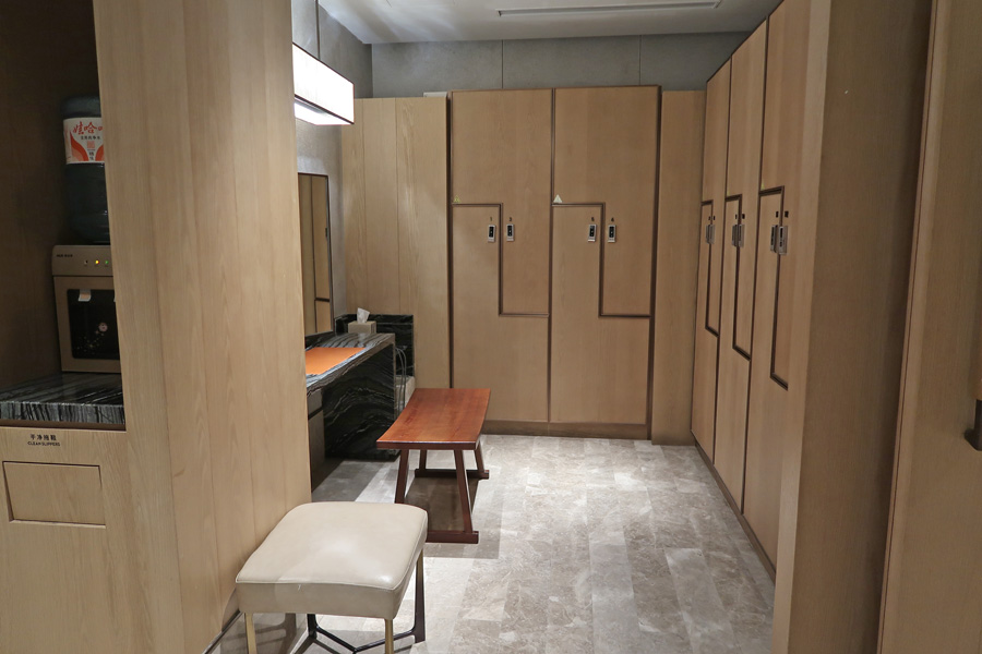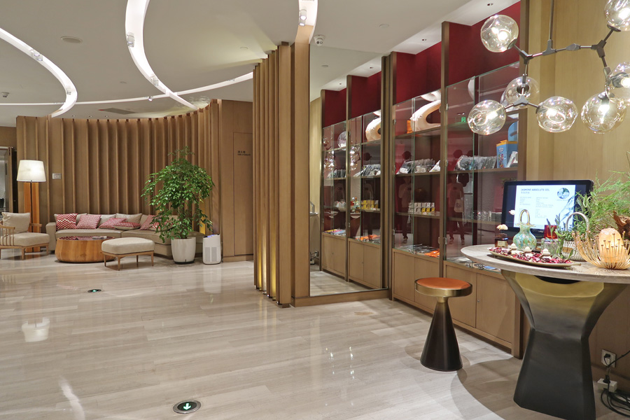 右/スパのレセプションエリア。明るく広い空間が確保されていて、ロッカールームは自由に利用できる。 |