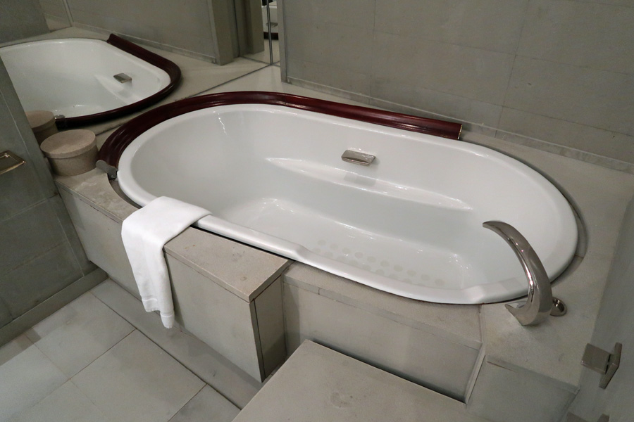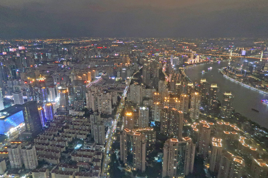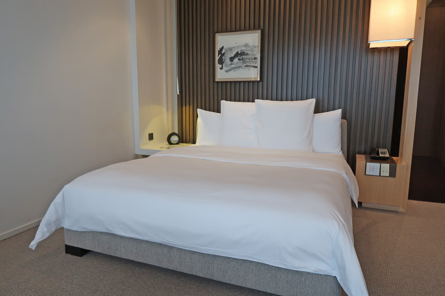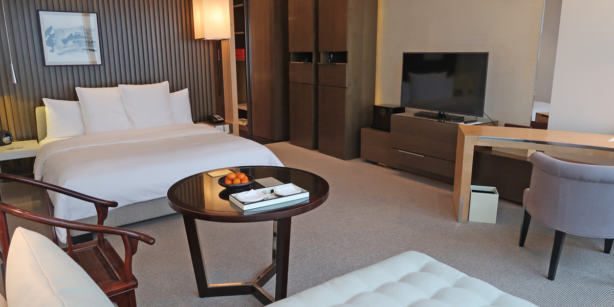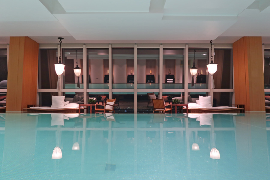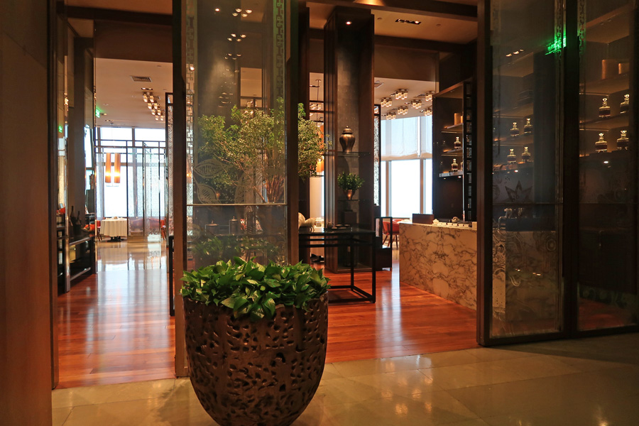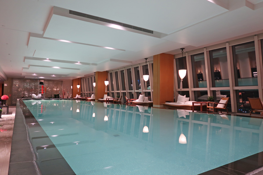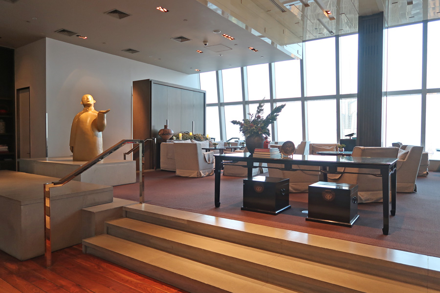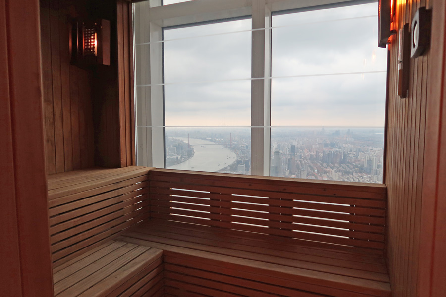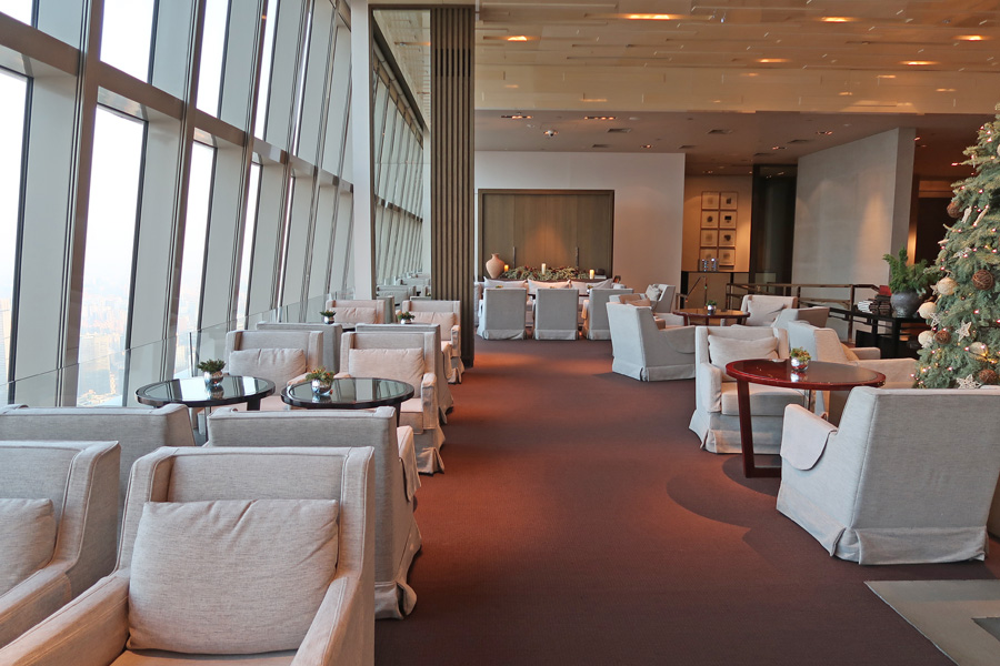 | 浦東新区の高層ビル群の中でも一際高く聳え立つ上海ワールドフィナンシャルセンターの79階〜93階部分を占有する超高層ホテル。エントランスのある1階から87階のロビーまでのエレベーターも高速なので上下移動のストレスは少ない。年始ということもありロビーラウンジや93階のダイニングは満席の状態で、特に夜は天気も回復して美しい夜景を楽しみに訪れるゲストで賑わっていた。宿泊客しか入れない85階のスパやプール、ゲストルームからも絶景のパノラマが広がり、非日常の世界に存分に浸かれた。 |