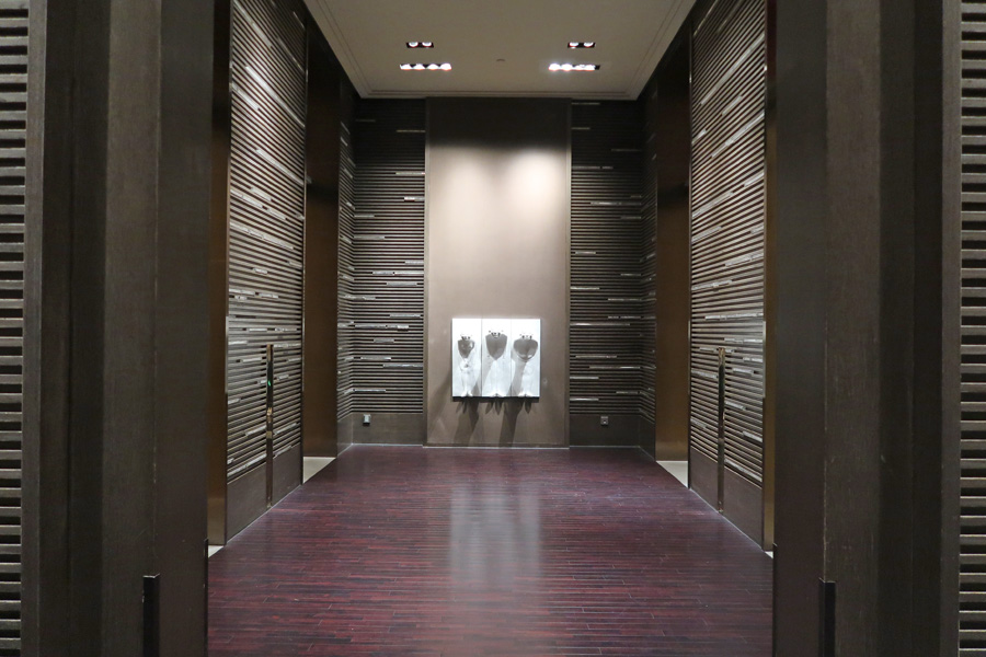 左/1階のエレベーターホール。館内の至るところに置かれた現代アートの彫像がゲストを迎えてくれる。