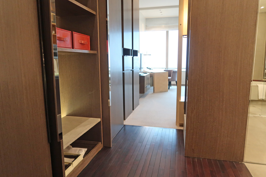 右/玄関から部屋までのアプローチ。クローゼットは中央の荷物棚を挟んで両側にあり棚も扉で隠せる。 |