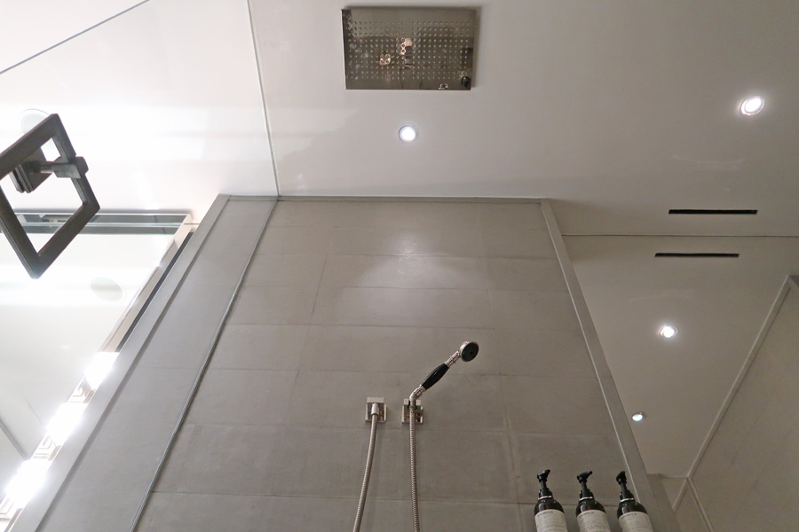 右/長方形のレインシャワーと対照的にクラシカルなハンドシャワー。水圧が強く身体が包み込まれる。 |