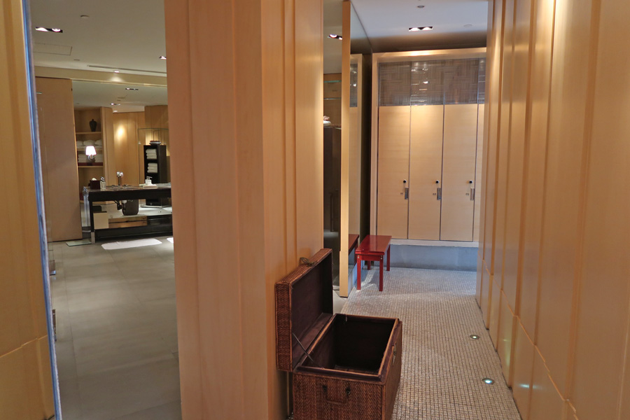 左/プールを左手に進んだホールに面したロッカールーム。洗面台の裏側にシャワーブースが備わる。