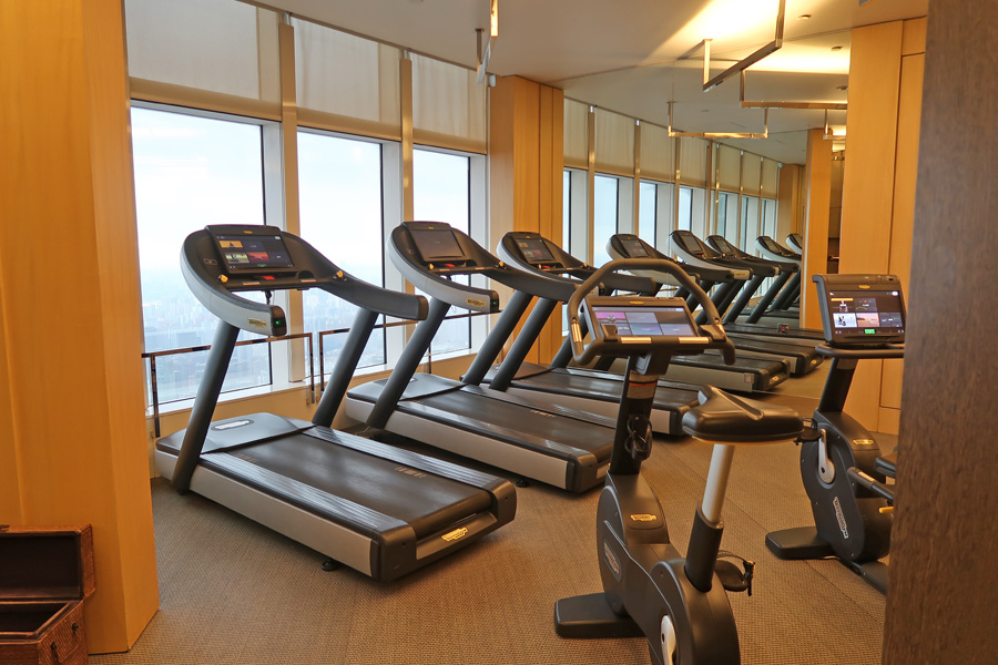 右/プールを右手に進んだ場所に設置されたフィットネスジム。広い空間ではないが眺望は間違いない。 |