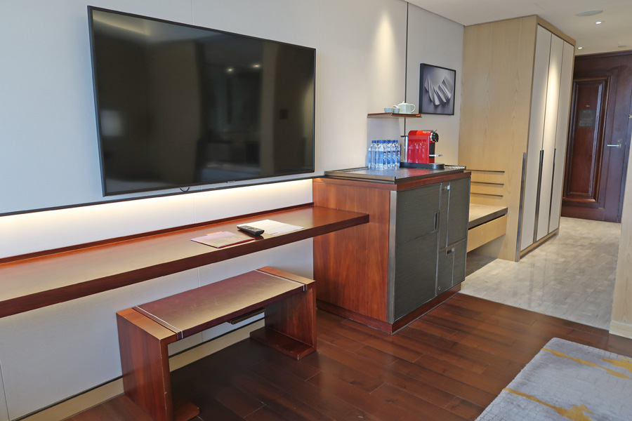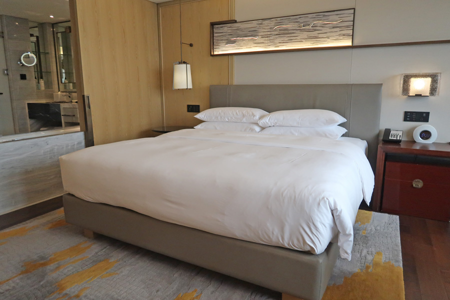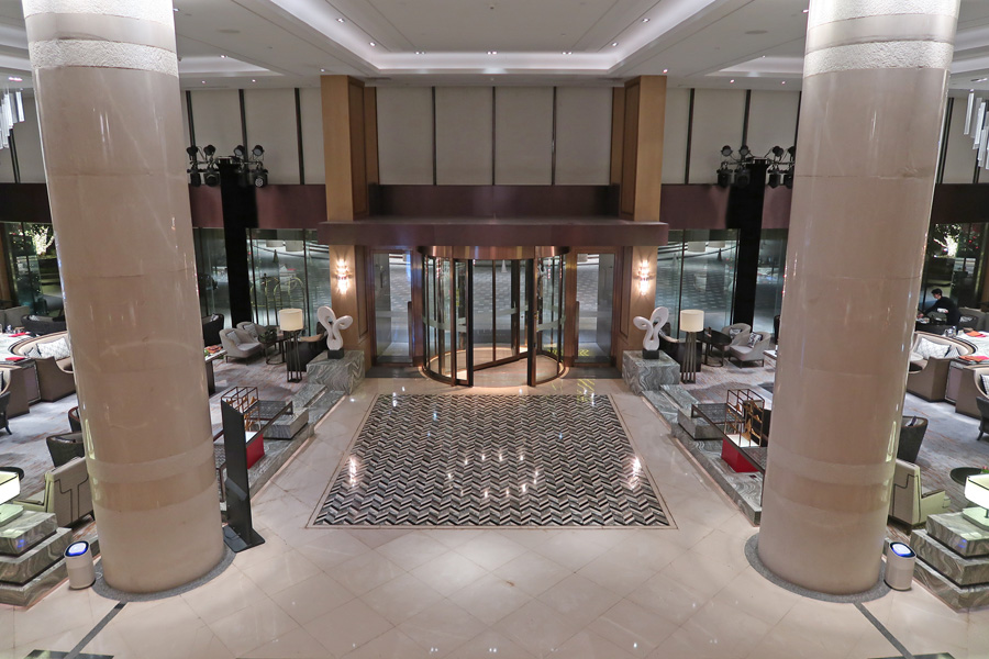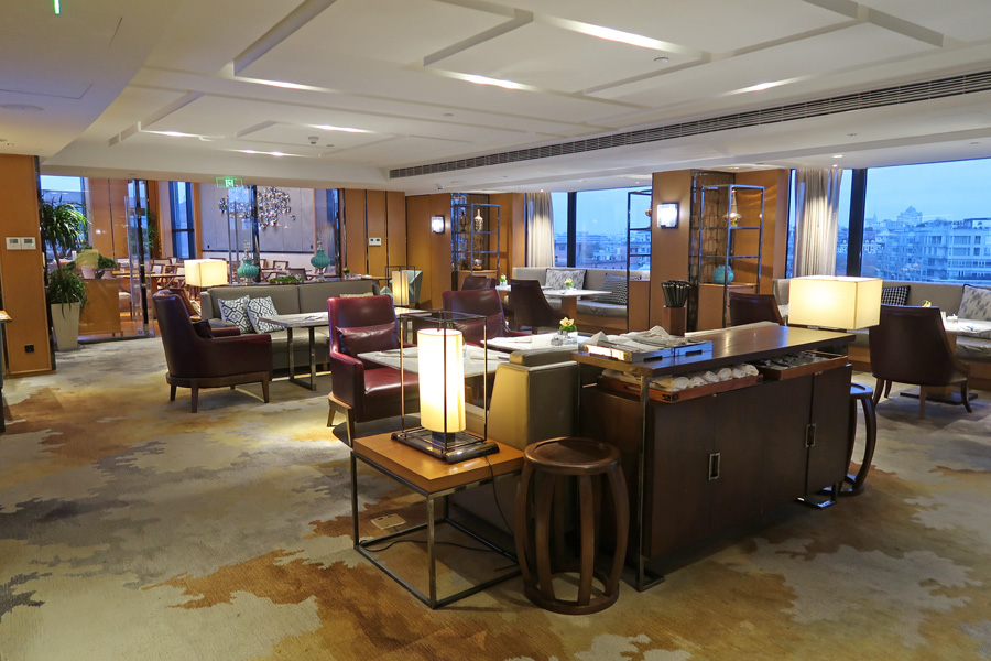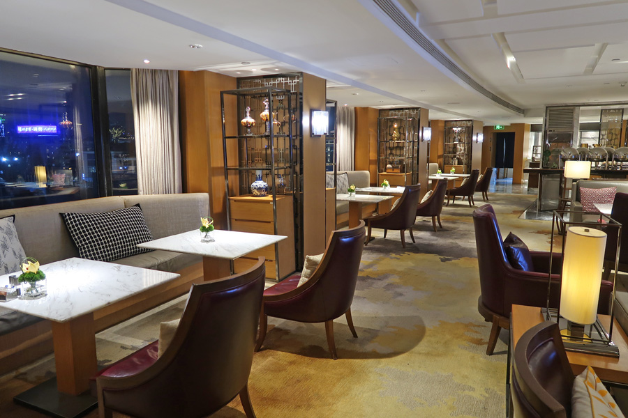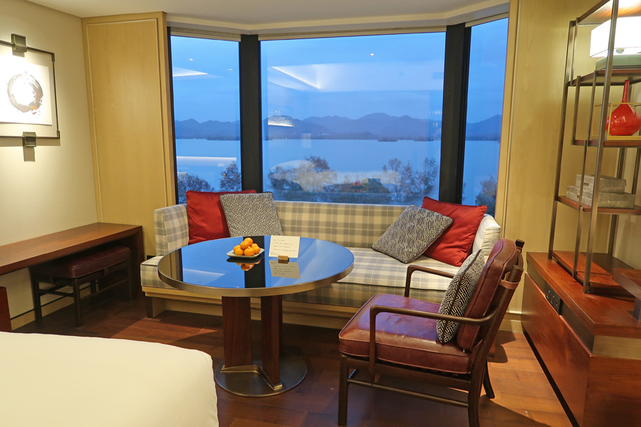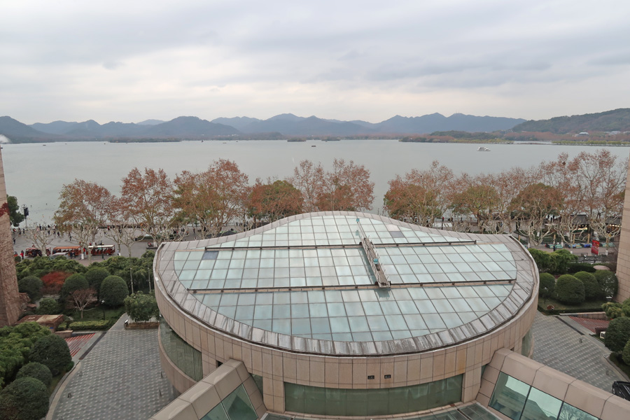 | 大都市でありながら市街地のすぐそばに世界遺産の西湖と大運河(京杭運河)を擁する一大観光地の杭州の中でも西湖の湖岸に立地し、かつ地下鉄での移動にも便利なロケーションに建つ希少なホテル。弧を描く館内は湖側の窓が少し小さくなってしまうものの出窓で眺望が確保され、山の斜面に家々の明かりが灯る夜景も美しい。館内は賑わいがありつつも落ち着いた雰囲気で、8階にあるクラブラウンジも充分な空間が確保され、朝食やカクテルタイムのフードメニューも豊富で滞在中は何度も足を運んだ。 |