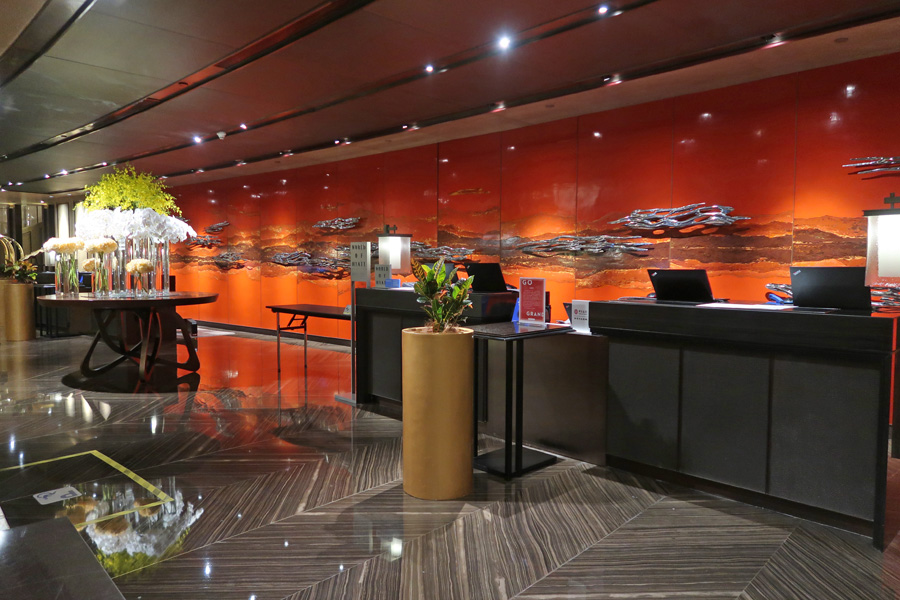 右/朱色のパネルが印象的なレセプションデスク。ゲストが待機できるシッティングスペースも用意する。 |