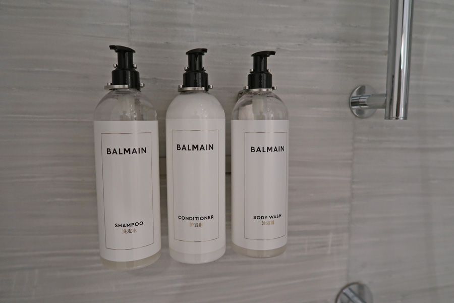 左/アメニティはフランス生まれのブランド、バルマンのプロダクト。ボディローションはボトルで提供する。