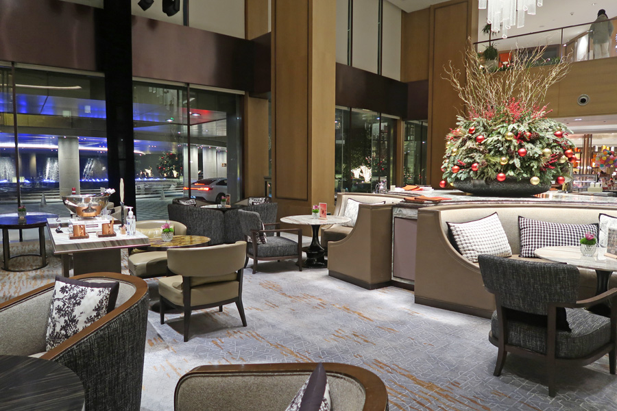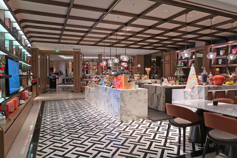 右/ロビーの北側にあるペストリーブティック。洒落た空間のカフェも併設されていて気軽に利用できる。 |