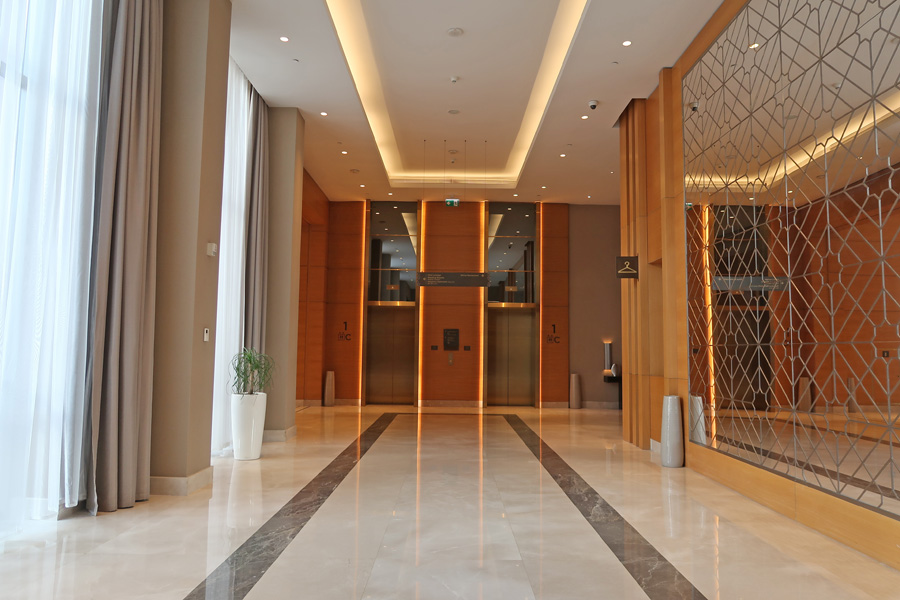 右/館内はエレベーターが3箇所あり、そのうち1箇所は7階にあるダイニングとスパ専用になっている。 |