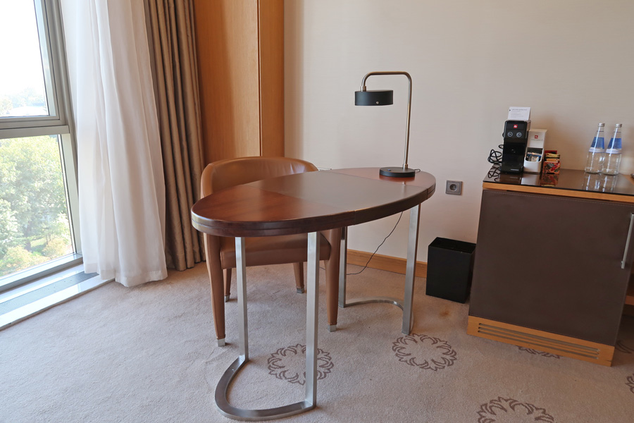 左/もう一方のコーナーには楕円形のライティングデスクが設置され、全体的に余裕のあるレイアウト。