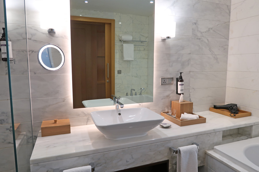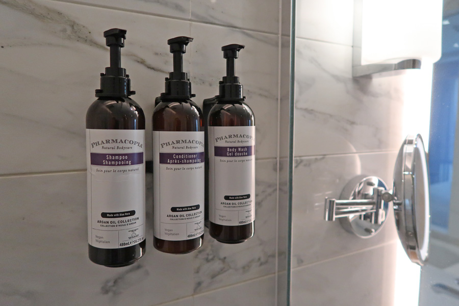 左/アメニティはハイアット系で馴染みのあるトルコ製のファーマコピア。歯ブラシ類も初めから備わる。