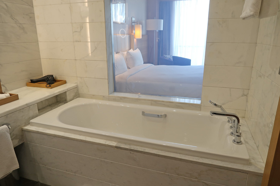 右/ベッドルームが見えるバスタブは浅めだが全身浸かれるサイズ。ボタンひとつで曇りガラスになる。 |