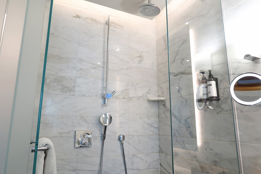 右/独立したシャワーブースは空間が広く使いやすい。お湯になるスピードと水圧は申し分ないレベル。 |