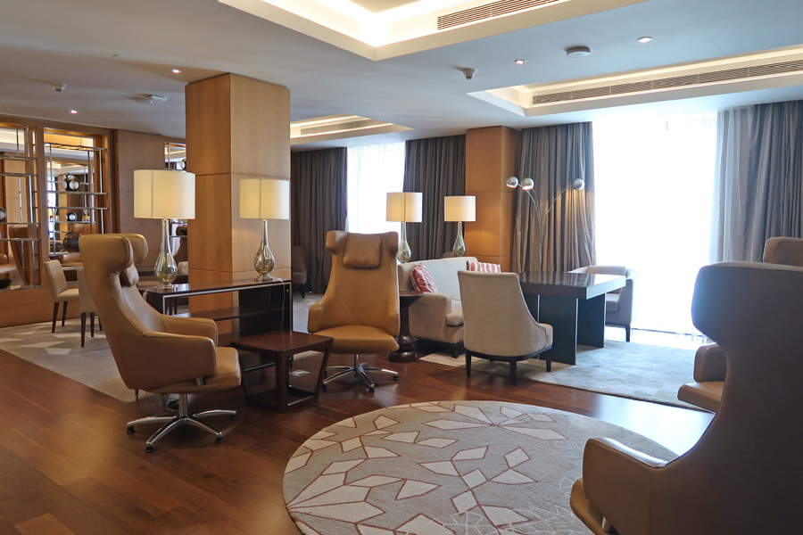 左/6階に用意されたクラブラウンジ。入口の右手が大型のソファを備えたラウンジエリアになっている。