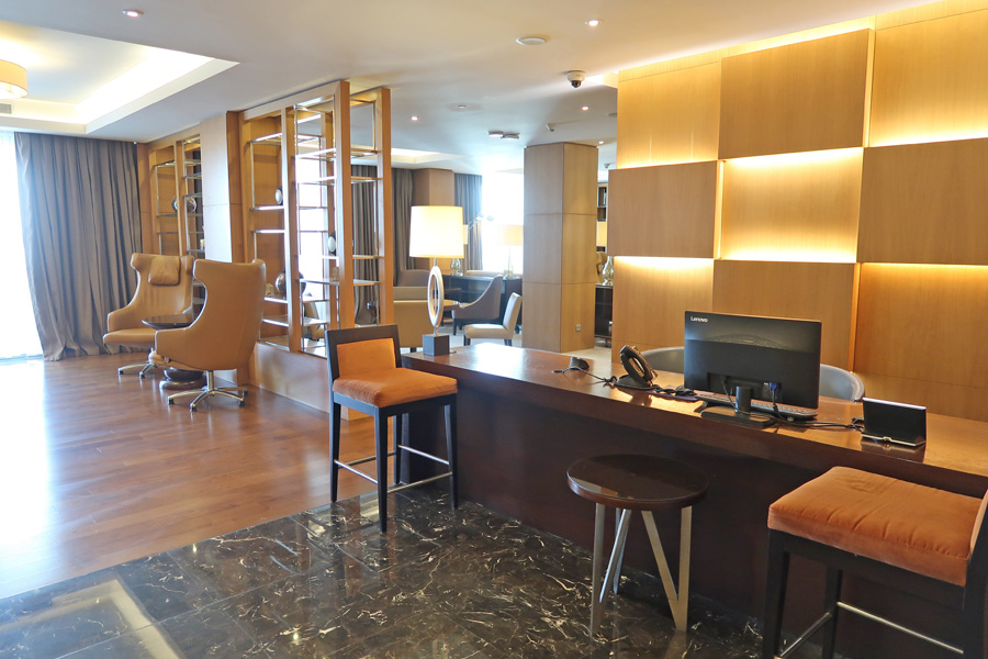 右/クラブラウンジのレセプション。日中はセルフサービスで夕方のハッピーアワーだけスタッフが常駐。 |
