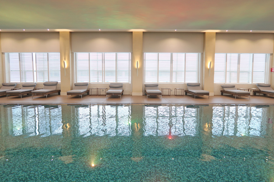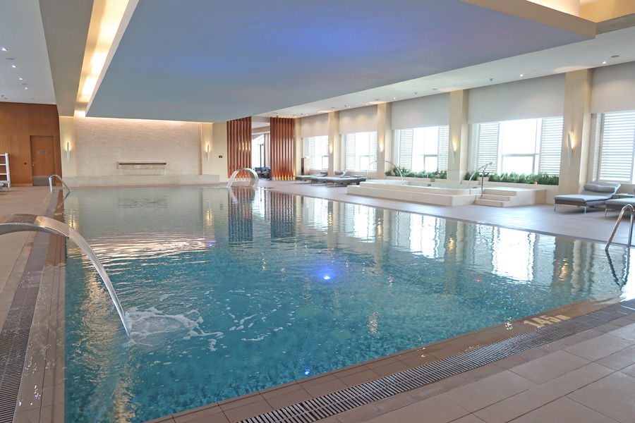 左/北側の棟の最上階に位置する20mサイズの屋内プール。横幅があるため数字以上に大きく感じる。