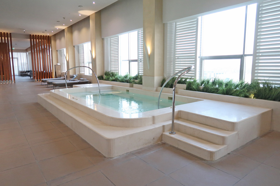 左/プールサイドの北側はスペースが広く取られていて、中央には大きめのジャグジーが備わっている。