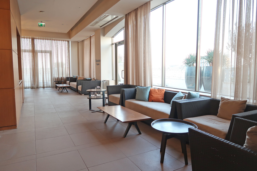 左/建物がコの字型のためロビーを中心に左右に空間が広がり、シッティングスペースも充分に備わる。