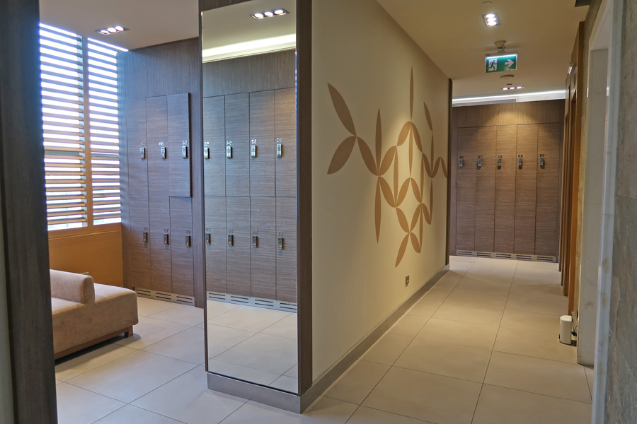 左/プールへの動線上に設けられたロッカールームはリラクゼーションエリアと2種類のサウナを完備。