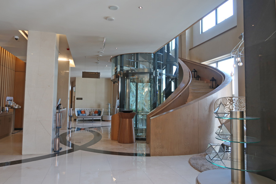 右/スパのレセプションエリア。8階にあるトリートメントルームへつながるエレベーターと階段が印象的。 |