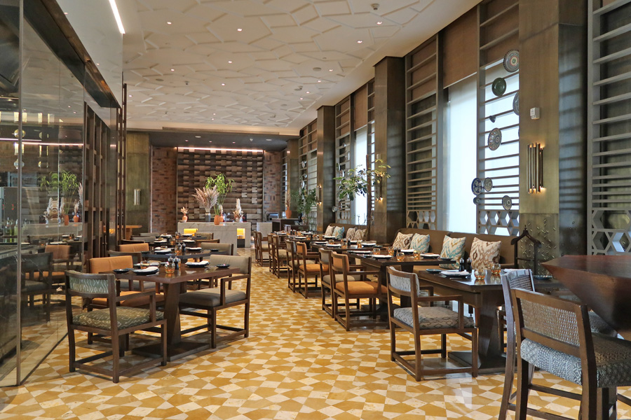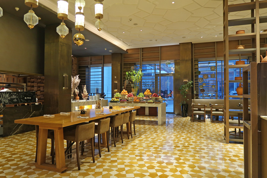 左/入口の左手はテーブル席とカウンターを備えたダイニングエリア。朝食は1階のヒヴァで提供される。