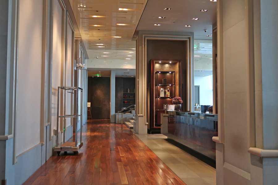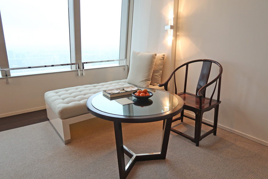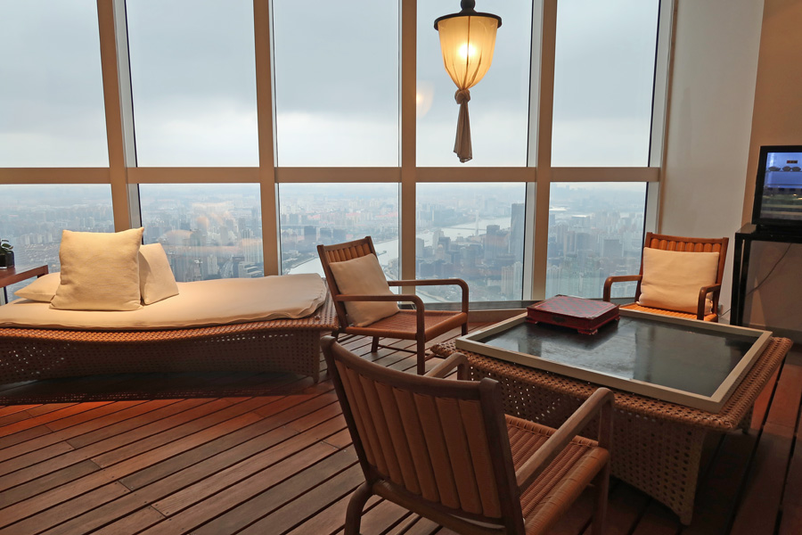 | 浦東新区の高層ビル群の中でも一際高く聳え立つ上海ワールドフィナンシャルセンターの79階〜93階部分を占有する超高層ホテル。エントランスのある1階から87階のロビーまでのエレベーターも高速なので上下移動のストレスは少ない。年始ということもありロビーラウンジや93階のダイニングは満席の状態で、特に夜は天気も回復して美しい夜景を楽しみに訪れるゲストで賑わっていた。宿泊客しか入れない85階のスパやプール、ゲストルームからも絶景のパノラマが広がり、非日常の世界に存分に浸かれた。 |